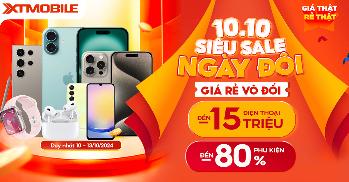 Mừng ngày đôi 10.10, XTmobile đem đến hàng loạt ưu đãi hấp dẫn cho cộng đồng yêu công nghệ. Trong đó, điện thoại iPhone, Samsung, Xiaomi, Google...giảm đến 13 triệu đồng. Máy tính bảng iPad, MacBook cùng các mẫu phụ kiện chính hãng khác giảm đến 80%. Nhanh tay săn deal ngay hôm nay để không bỏ lỡ bạn nhé!